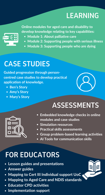 This learning content is for people who are working in care worker roles in residential aged care and home care support, and those studying certificate-level courses in aged care.